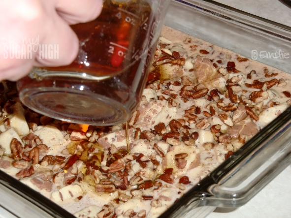 Sprinkle with pecans and drizzle 3/4 cup syrup over the top. Bake at 375 for 20 to 28 minutes or until golden brown. Cool 15 minutes.